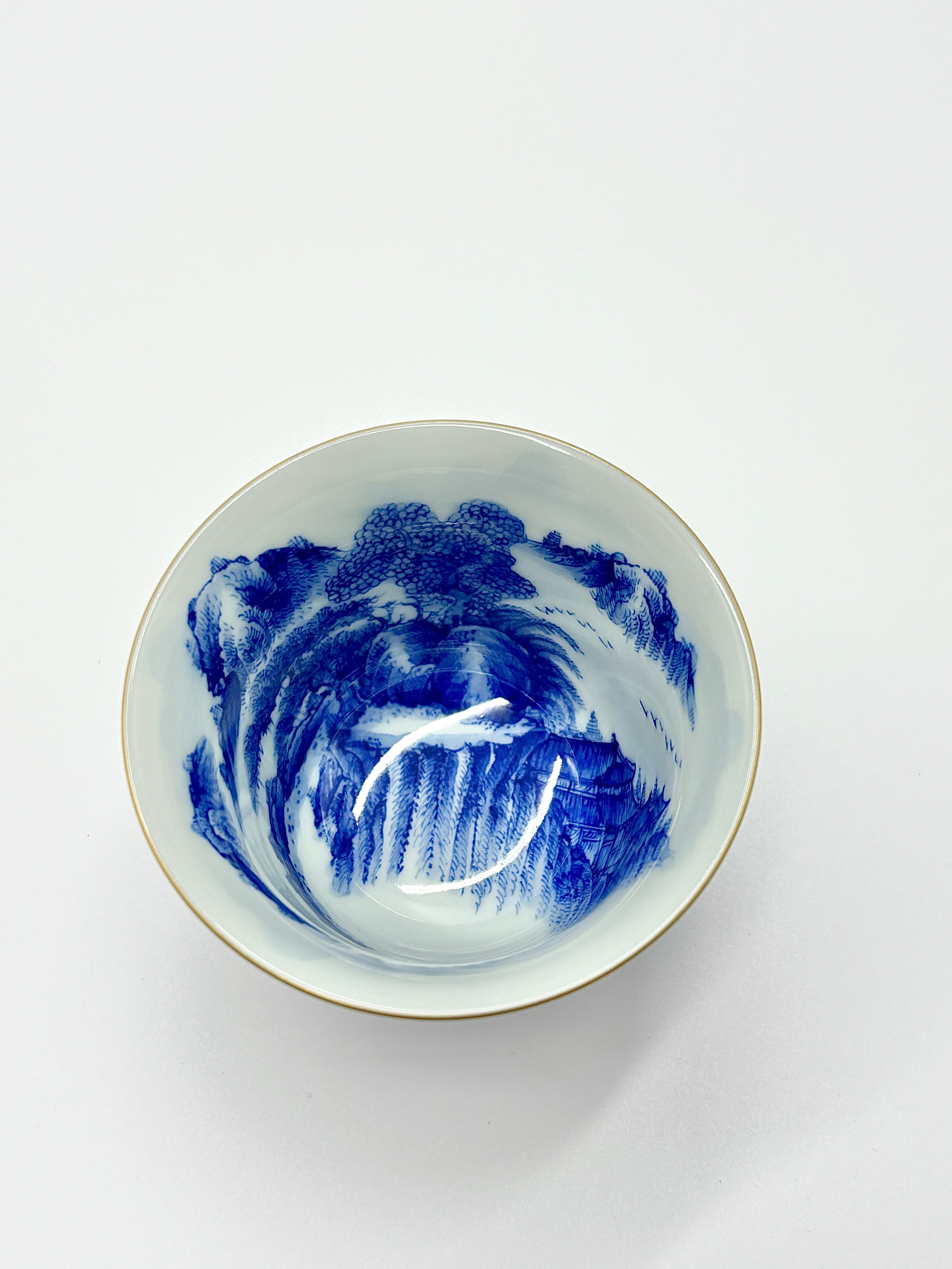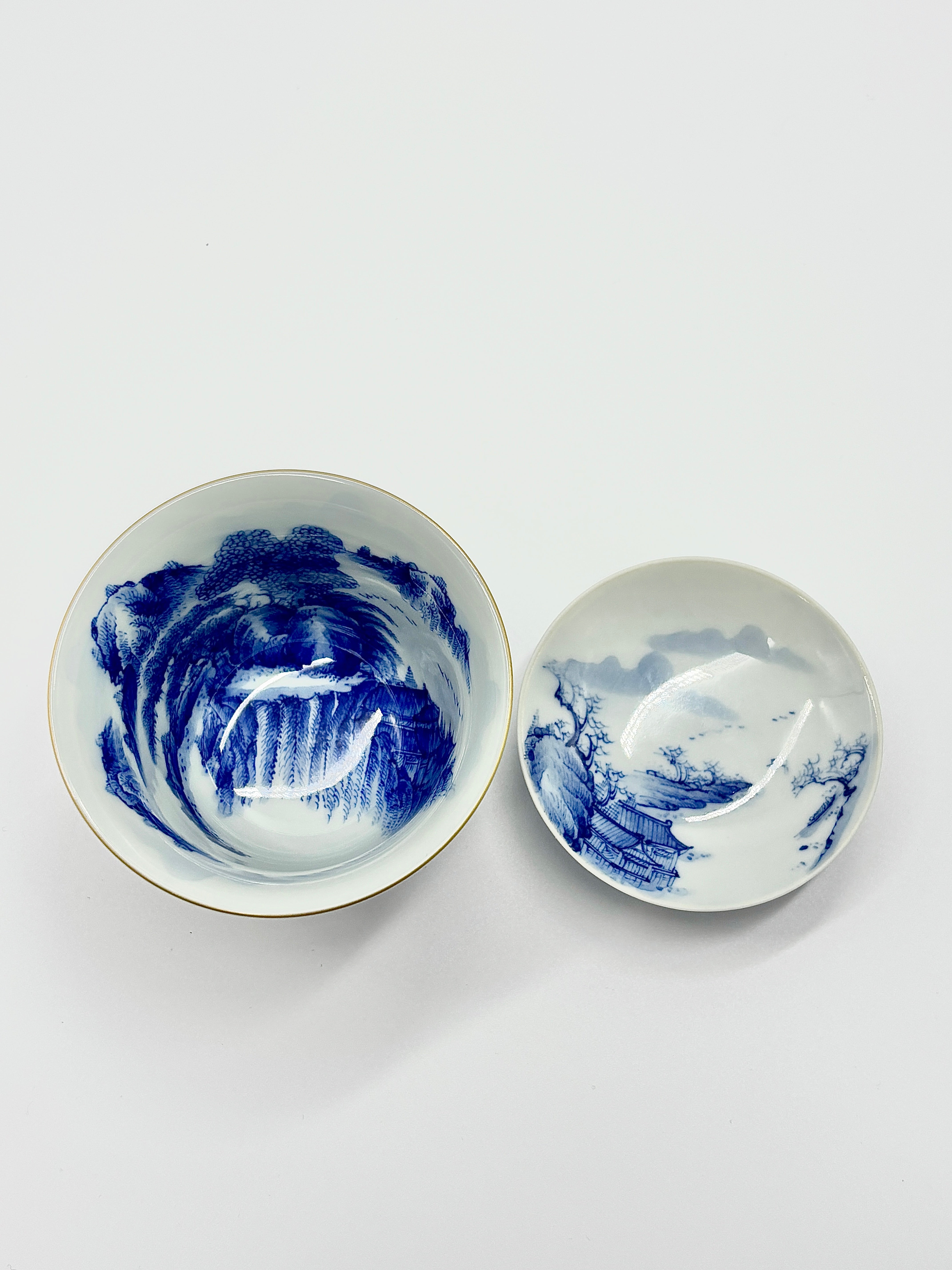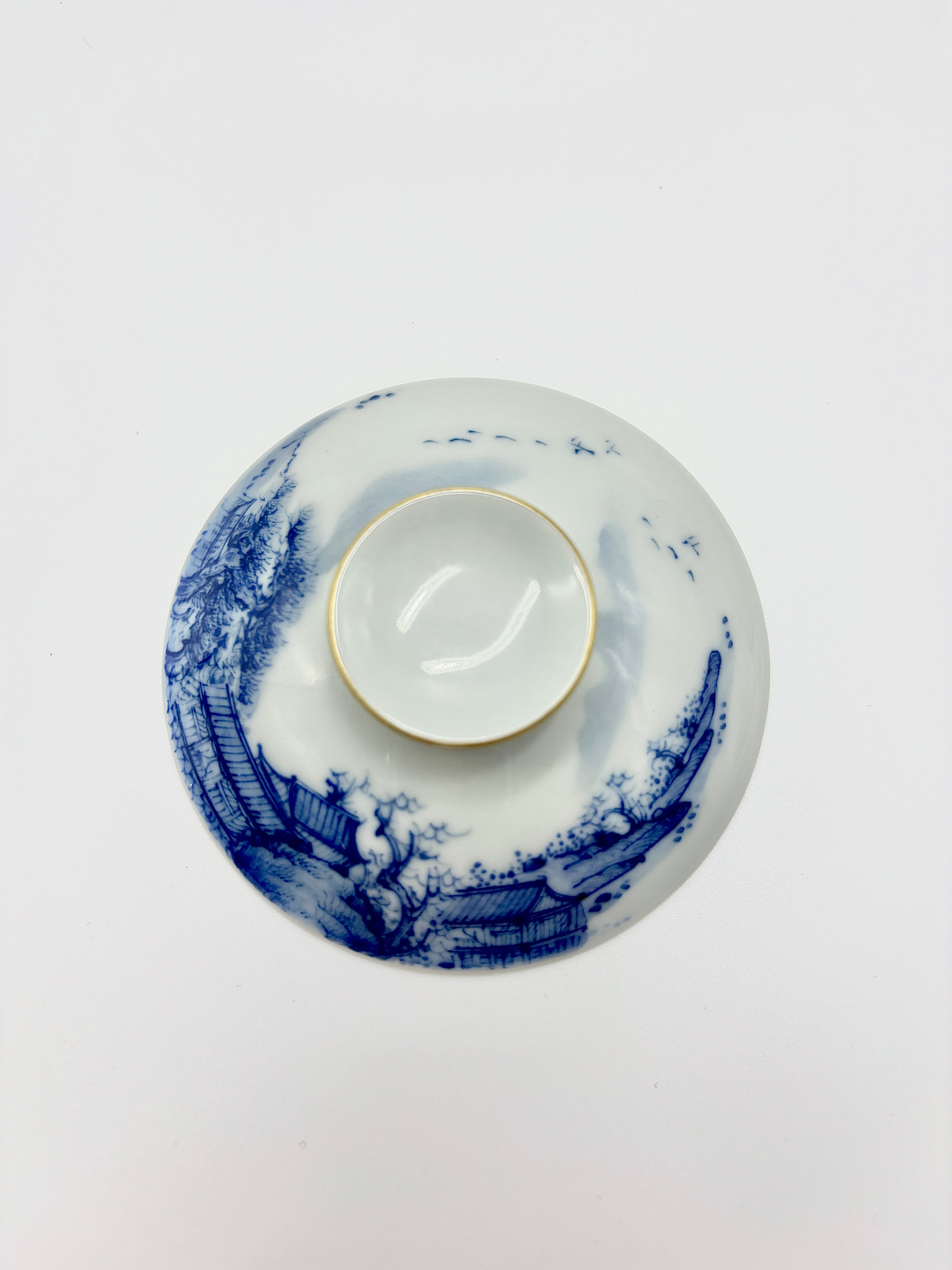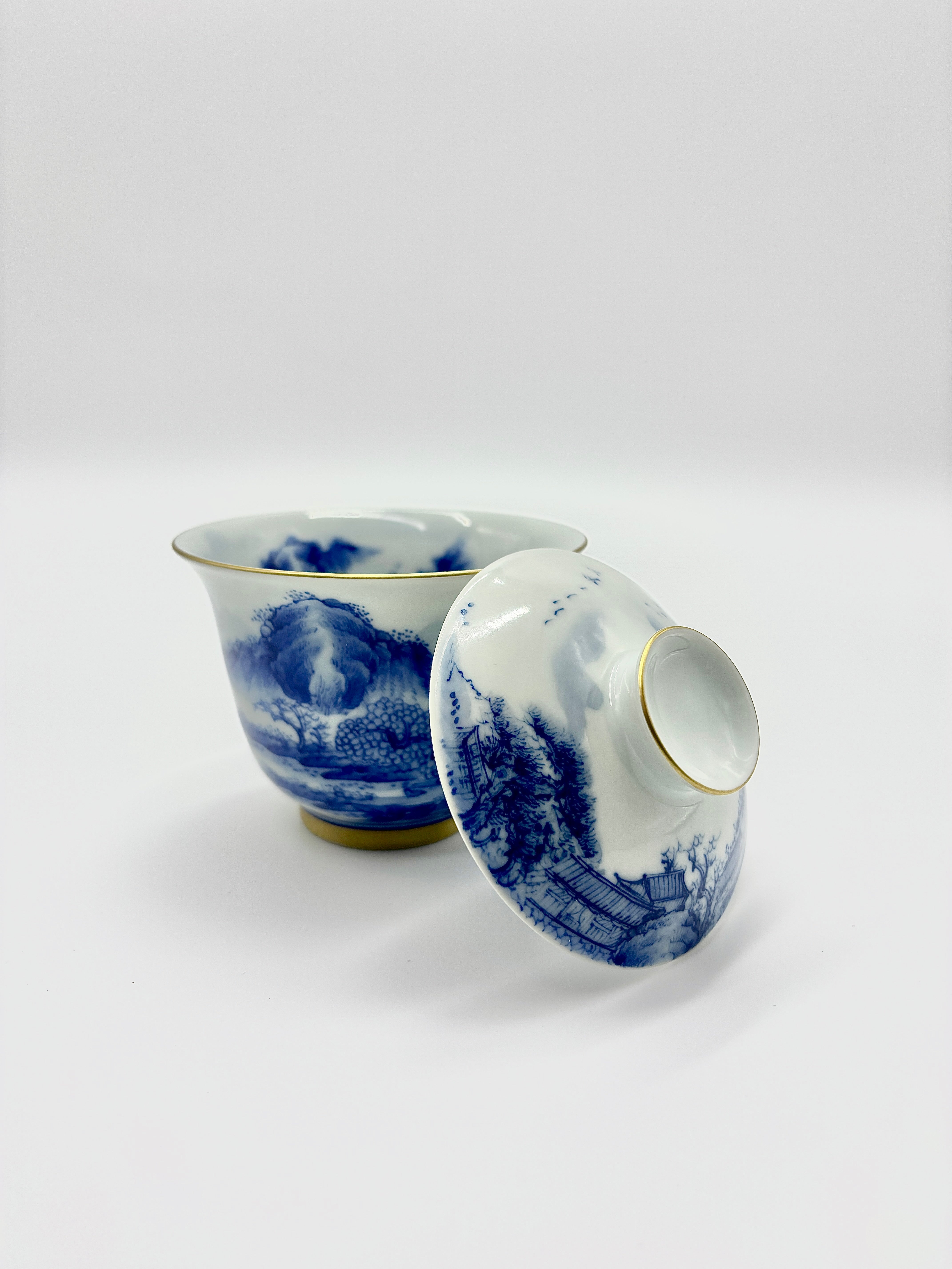 This gold-painted landscape covered bowl is produced in Jingdezhen, Jiangxi Province . It is made from high-quality porcelain clay and presents the elegant and dignified beauty of blue and white porcelain. The entire bowl is decorated with a hand-painted landscape scene . The composition is grand and the brushstrokes are delicate. The undulating mountains and swirling clouds and mist showcase a strong oriental artistic conception.
