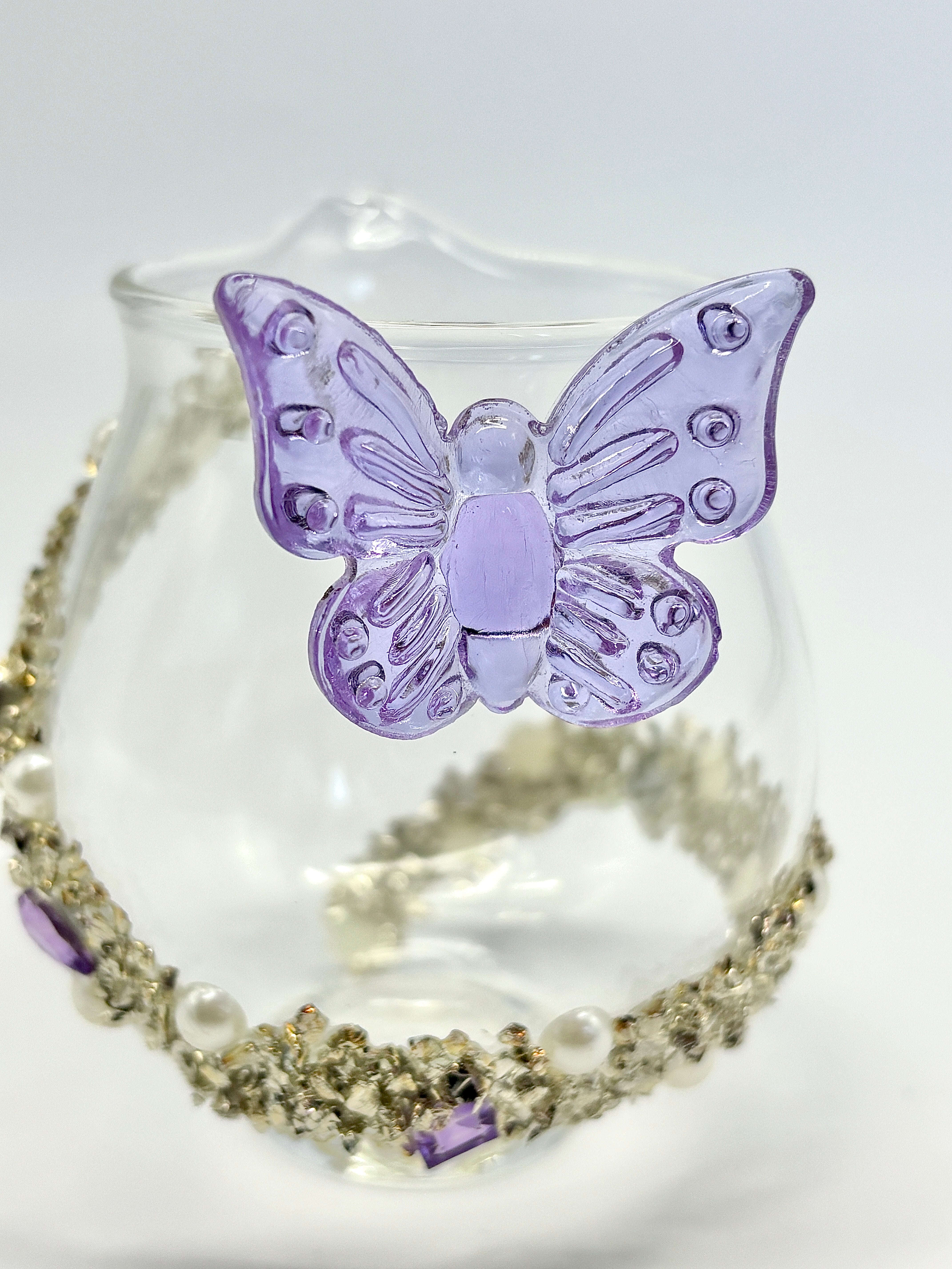 The cup is adorned with delicate rhinestones around its perimeter, creating a sparkling effect that echoes the purple butterfly handle. The subtle yet exquisite design adds depth and sophistication to the overall piece.