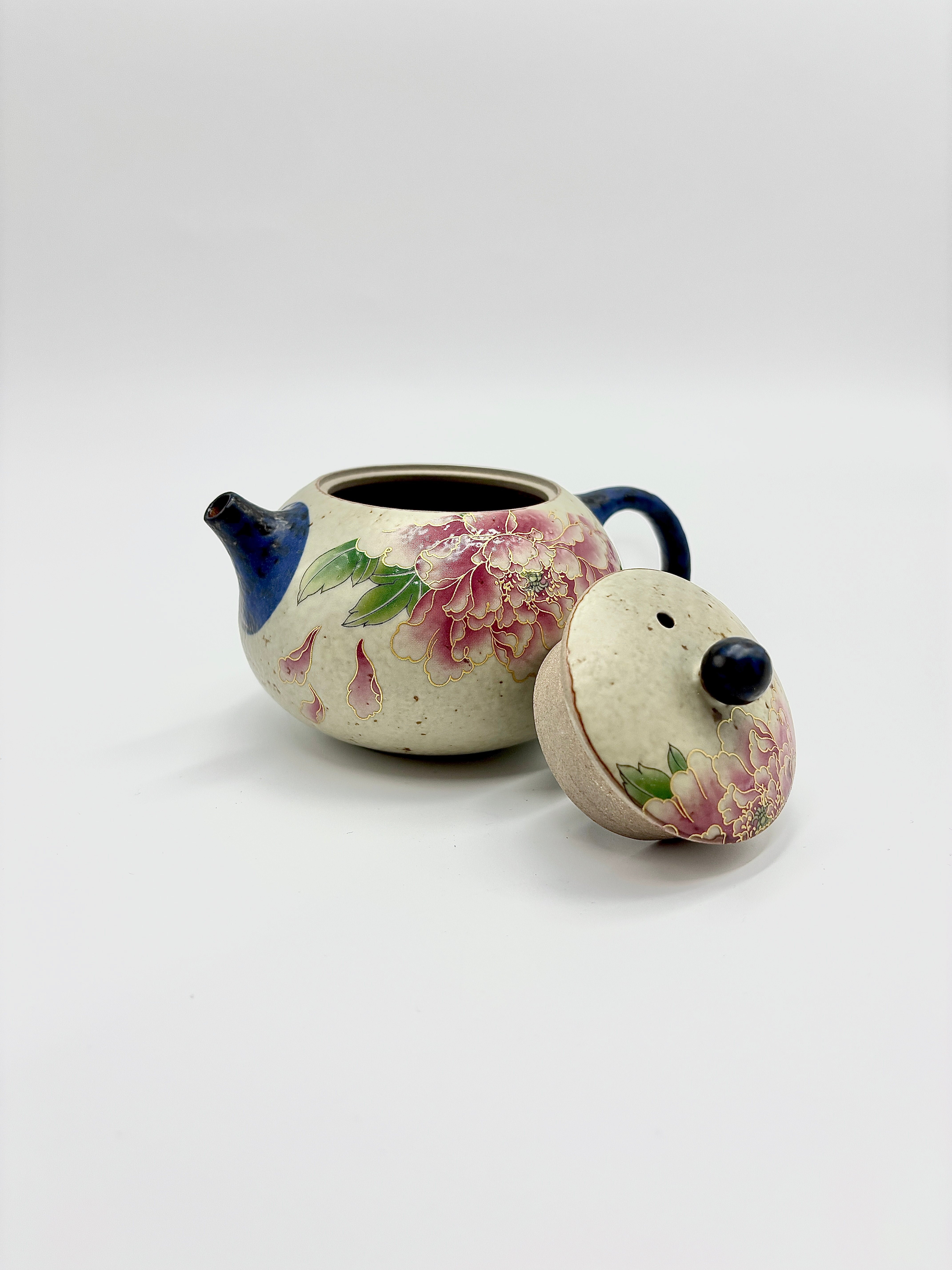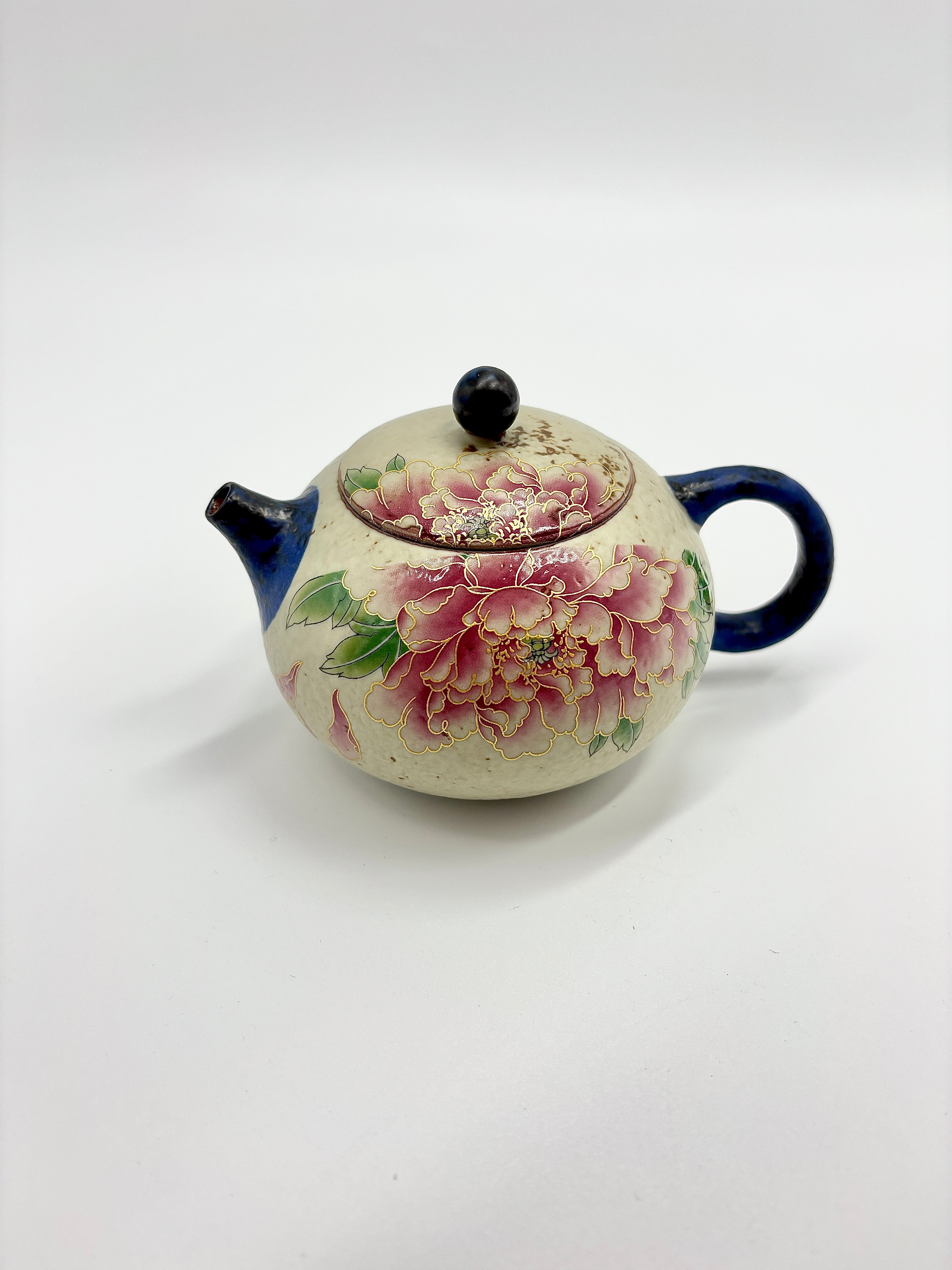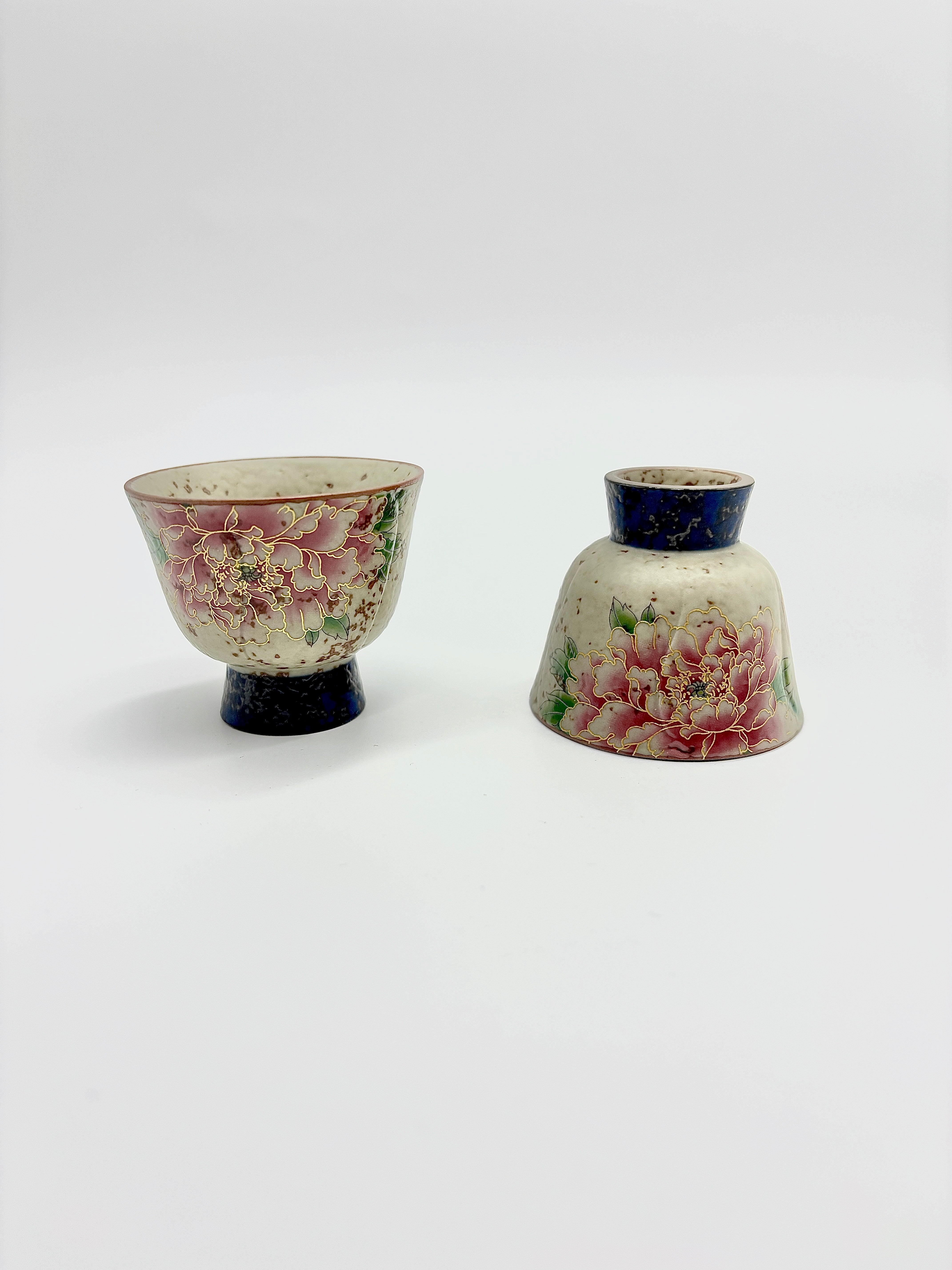 This set of gold-threaded peony Xishi teapots includes one teapot and two cups, with an overall elegant and graceful design. The body of the vessel features intricate patterns rendered using the underglaze blue and flint technique, further enhanced by gilding. The lines are clear and the layers distinct, showcasing the beauty of traditional craftsmanship.