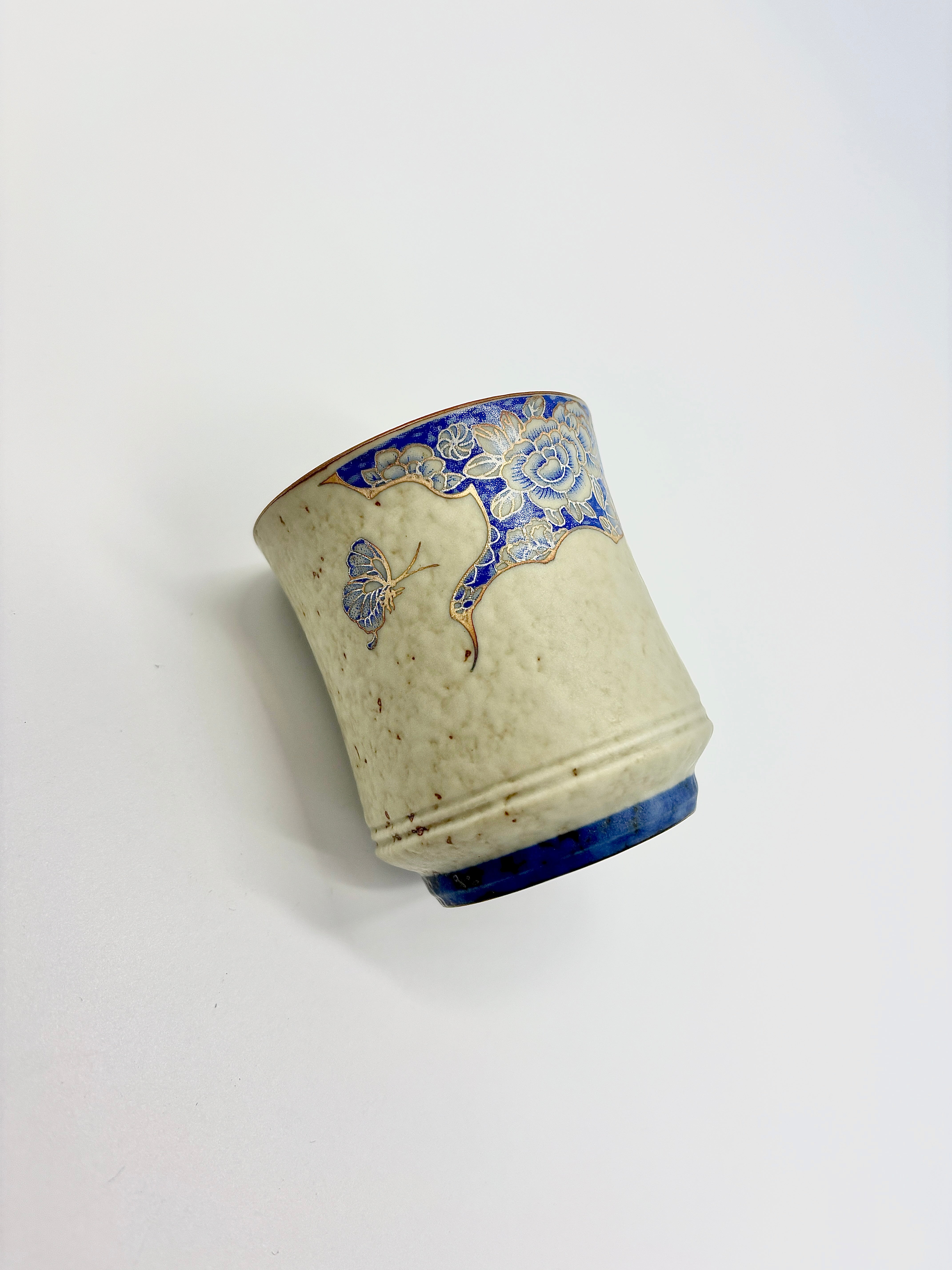 The cup features a warm beige base with a soft and natural hue, complemented by blue peony patterns and delicate silver thread embellishments, creating distinct layers and a harmonious balance. The cobalt blue flint technique gives the patterns a natural, diffused effect, with lines that are both lively and delicate. The blue flowers are elegant, while the silver thread outlines add a touch of understated luxury.